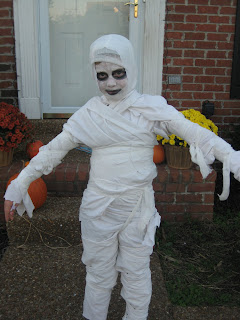 Last night Baylee had a costume birthday party to go to. She had been saying for some time she wanted to be a mummy. SO...Seth got some sheets and shredded them. He wrapped her up and I painted her face and off we went to the party. She was unrecognizable to those who didn't see her walk in with me, and she looked great! She won the scarriest Halloween costume award and is SO proud of her ribbon. However, after a night of gauze and sheets unraveling, she's decided not to be a mummy for Halloween afterall! Tonight was another costume party, so Seth took her to buy one this time. Our mummy made an amazing transformation to Alice from Alice in Wonderland! Accompanying Alice to the party was Madison the pink cat, and Strawberry Shortcake! They looked adorable and after dropping the 3 off at the party, Britton, Seth, and I went on a date to dinner! It is so weird only having a baby at a restaurant! What a fun and eventful day!
